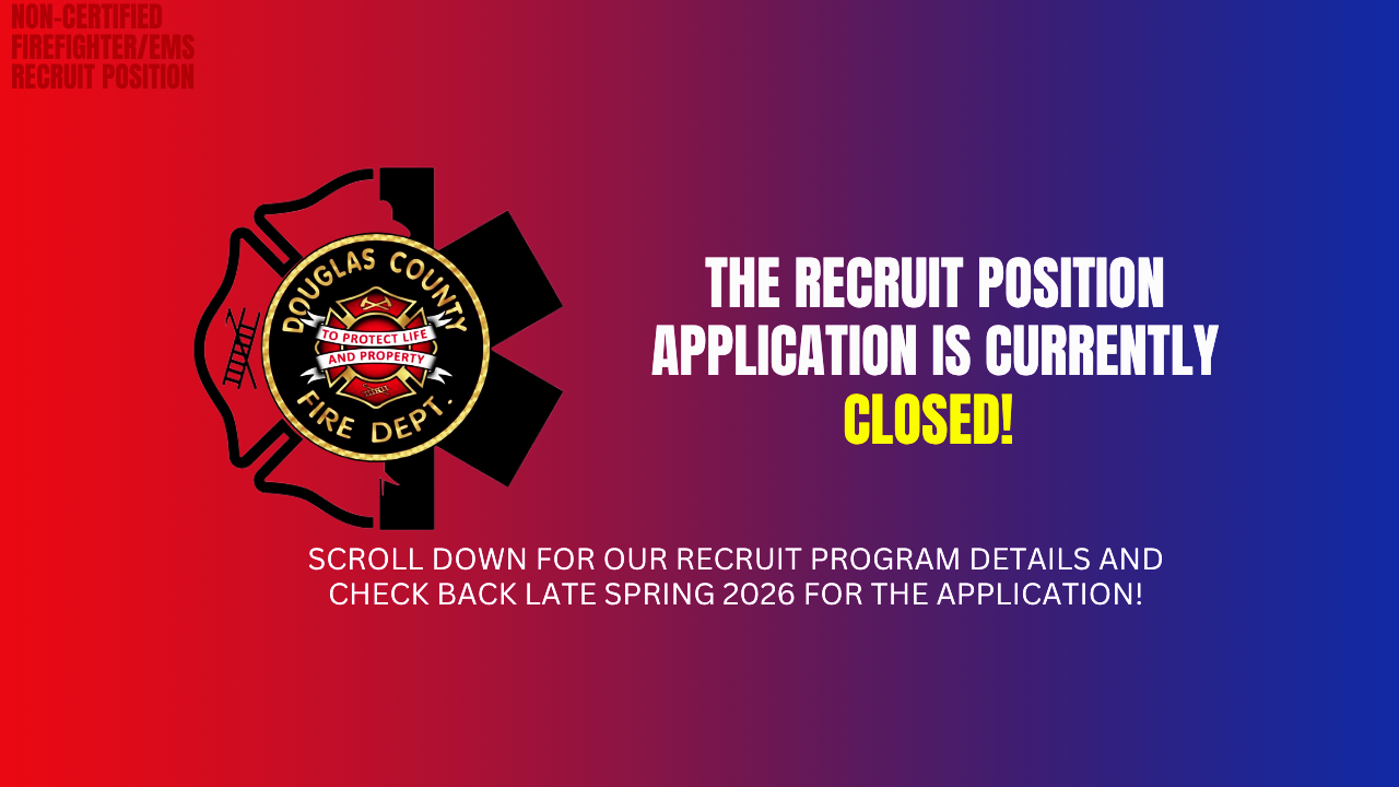 Fire recruit classes are offered in-house at the Douglas County Fire Department Training Complex. Recruit school is 7 to 10 weeks in length and employees will be placed on a Monday thru Friday work week through the duration of recruit school. All employees are required to obtain their National Professional Qualifications (NPQ certification) within 1 year from their date of employment.